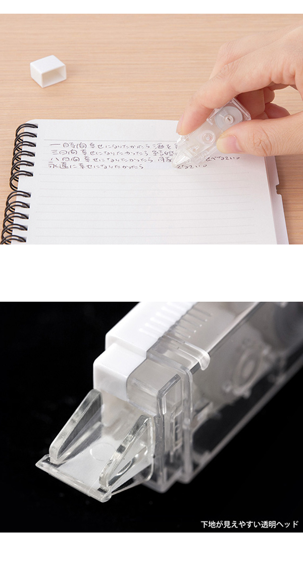 ヘッド部分と本体の片面が透明なのでテープの引き始めや残量が把握しやすく小さいながらも、とても使いやすい修正テープです。