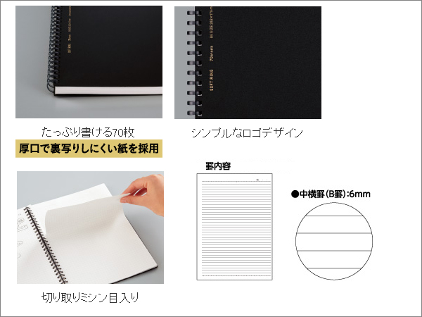 - 通常のソフトリングノートよりも紙を厚くした裏写りしにくいリングノートです。