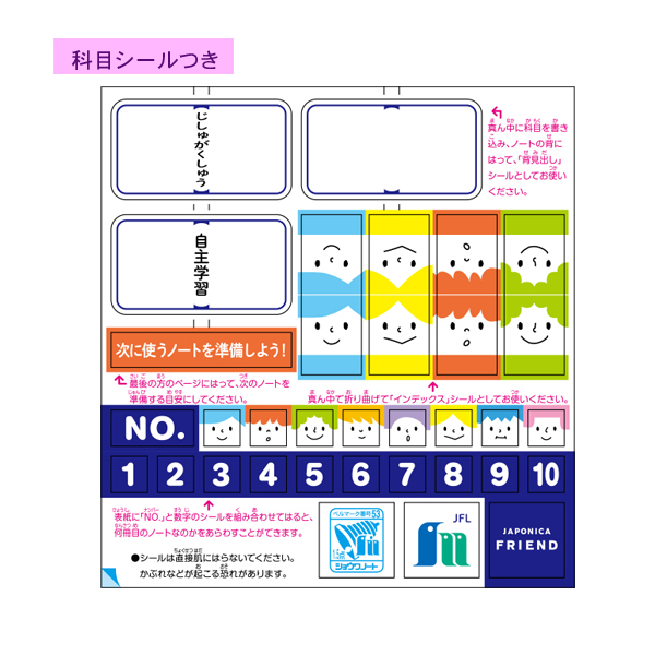 真ん中で折り曲げてインデックスとして使えるシール・何冊目のノートか分かるナンバーシール・最後の方のページに貼って次のノートを用意する目安になるシール・いろんな表情をした顔シールがついています。