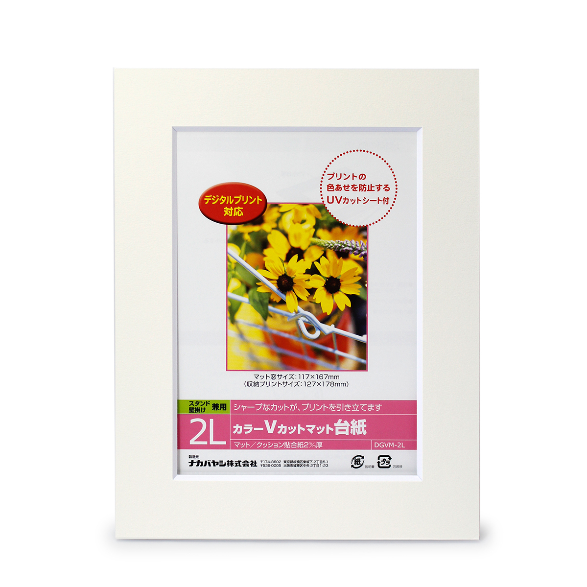 - スタンド・壁掛け兼用の2Lサイズ対応 Vカットマット台紙です。