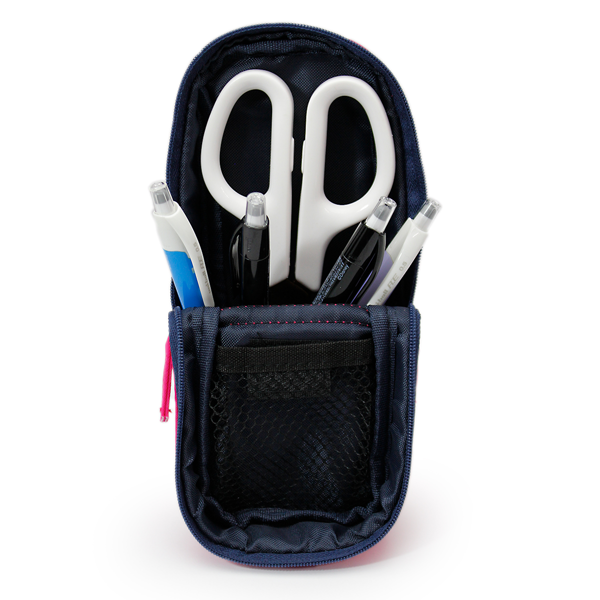 ファスナーを開けてフタを折り曲げるとペンスタンドとして立てられるペンケースです。