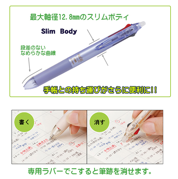 - 摩擦熱で無色になるインキを搭載したスリムボディ3色ボールペン