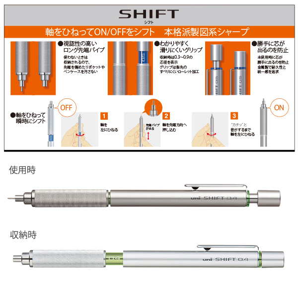 三菱鉛筆 シフト製図系シャープ 0.4mm シルバー M4-1010.26 軸をひねってON/OFFシフト