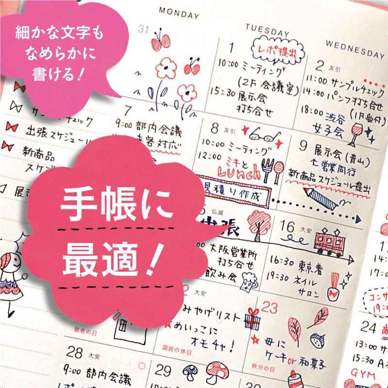 優れた速乾性で油性ボールペンにありがちな描線にふれて手が汚れるといったストレスが軽減。