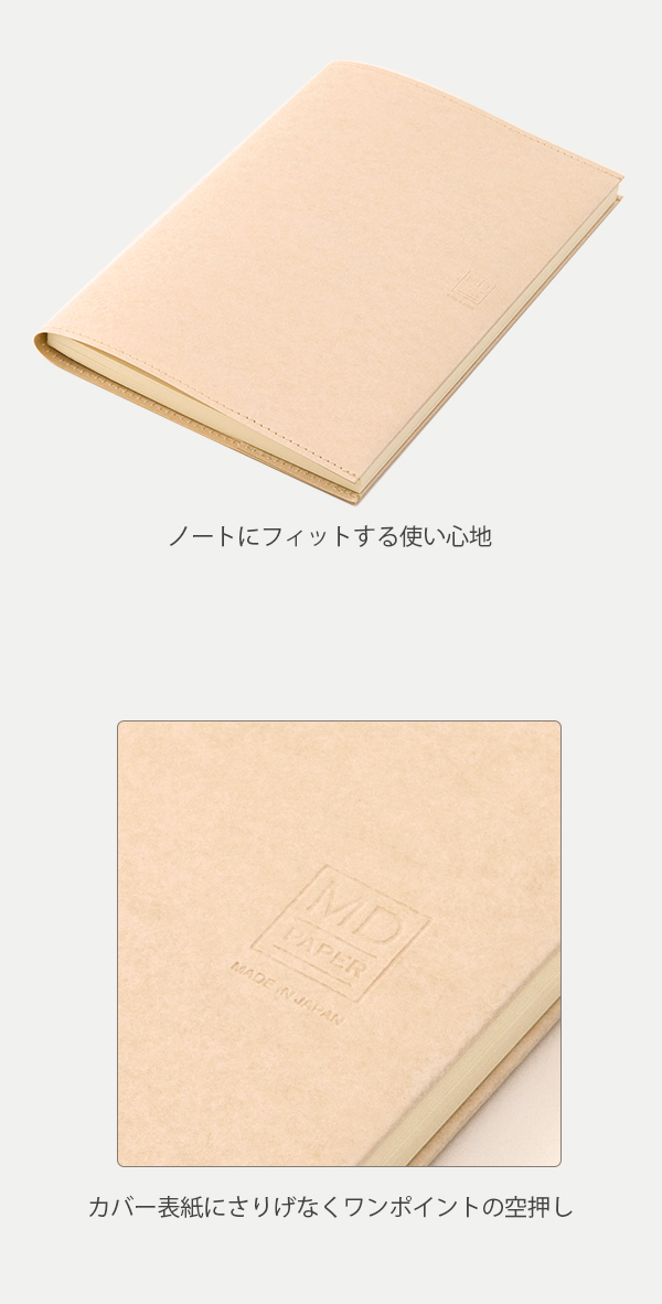 ノートにフィットする使い心地を愉しめる軽くで丈夫なMDノート専用の紙のカバーです。