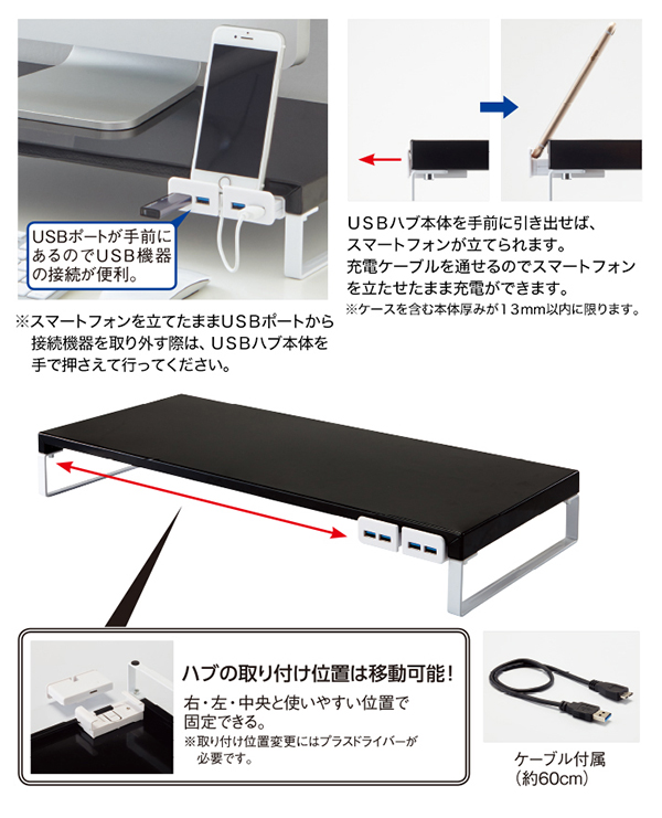 USBハブ本体を手前に引き出せば、スマホを立てたまま充電ができます。