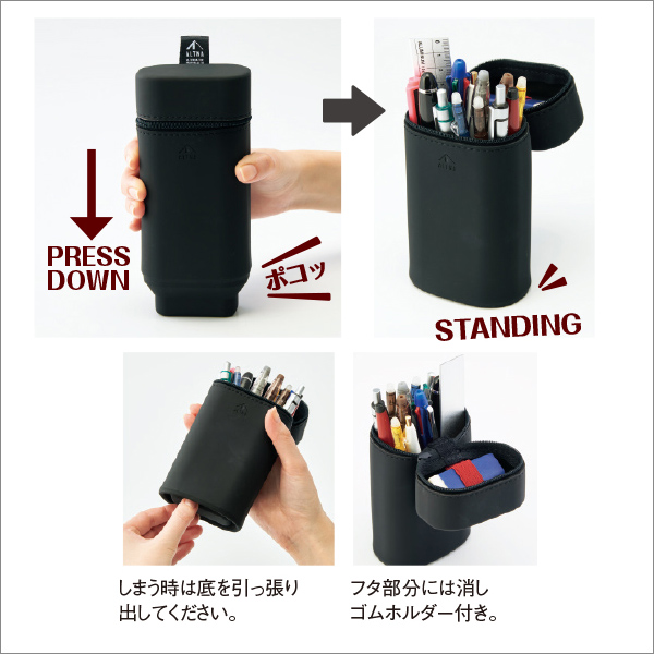 オマグネット入りのフタでスチール面にピタっと貼り付けできるスタンドペンケース。