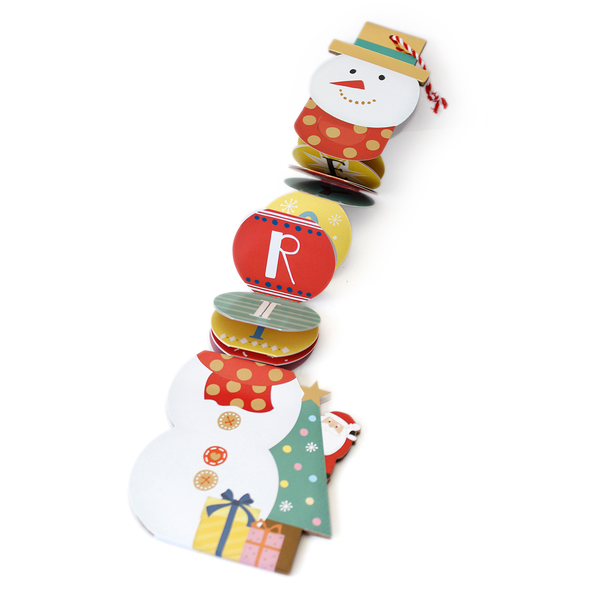 - 雪だるまの首がじゃばらに伸びるたのしいクリスマスカードです。