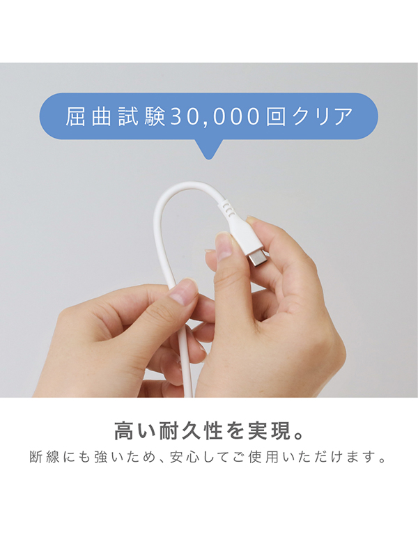 すっきりまとまる!持ち運びに便利なやわらかシリコン素材のケーブルリング付屈曲試験30,000回をクリアした高い耐久性を実現。断線しにくいので、安心してご使用いただけます。