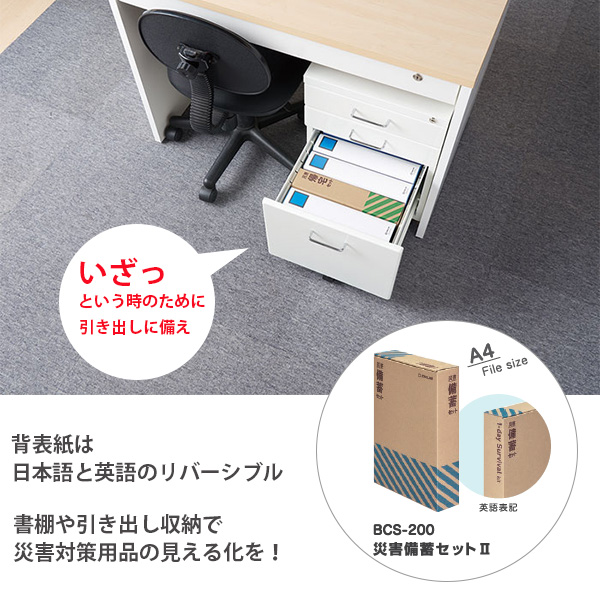 災害発生当時は安否確認や被害状況の確認、避難場所の確保などで災害対策に追われます。書棚や引き出しに収納しやすく、個人で管理しやすいこの災害対策セットなら、配布の手間が少なく、個人単位で早い対応が可能です。