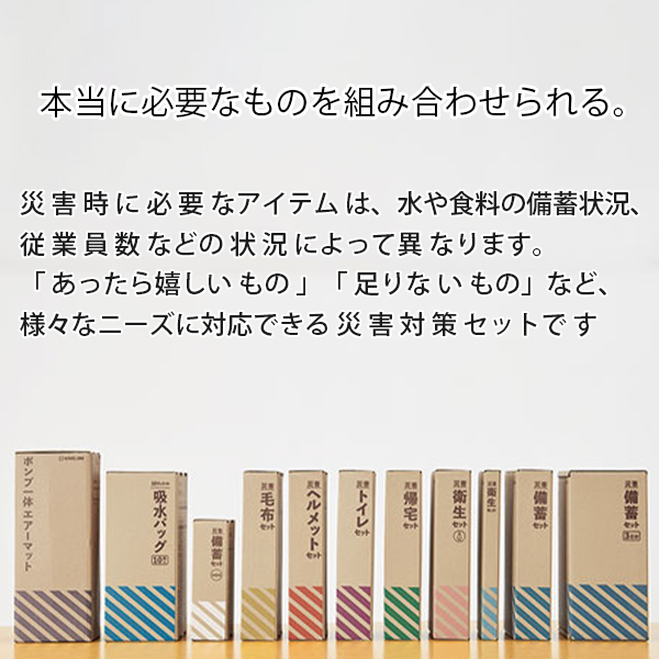 一刻を争う災害時やテレワークなどで担当者や責任者が不在の場合、防災担当者の指示を待つことも難しくなります。この災害対策セットなら、個人管理の引き出しやロッカーに収納しておけば、いざという時に素早い対応が可能です。