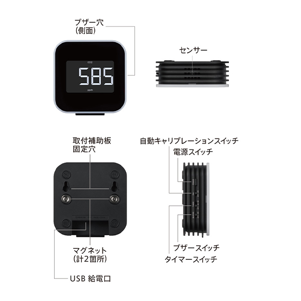 - CO2濃度を検知して換気のタイミングをライトとブザーでお知らせ