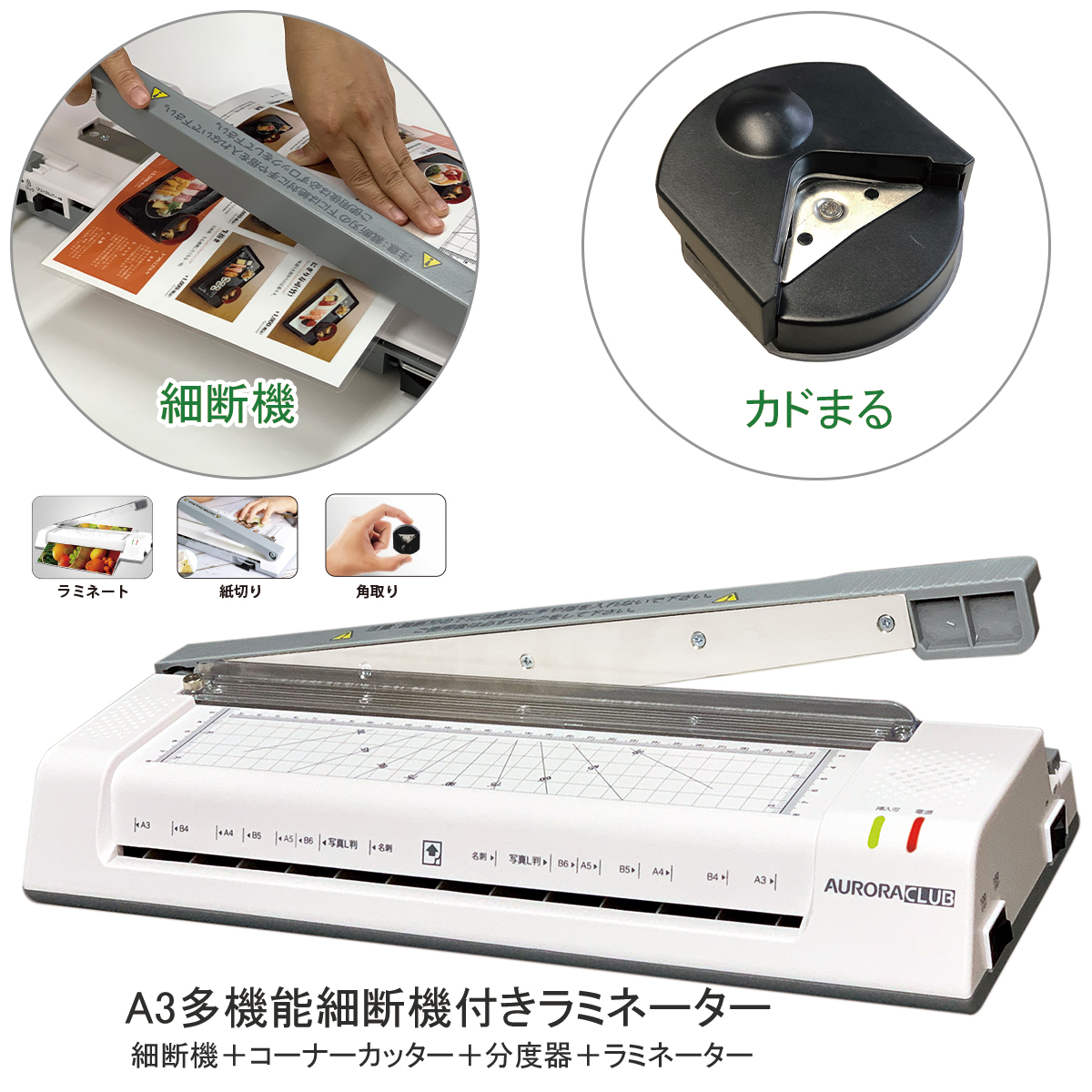 ラミネート以外裁断機、コーナーカッター、分度器の多機能付いた複合機としての特徴があります。