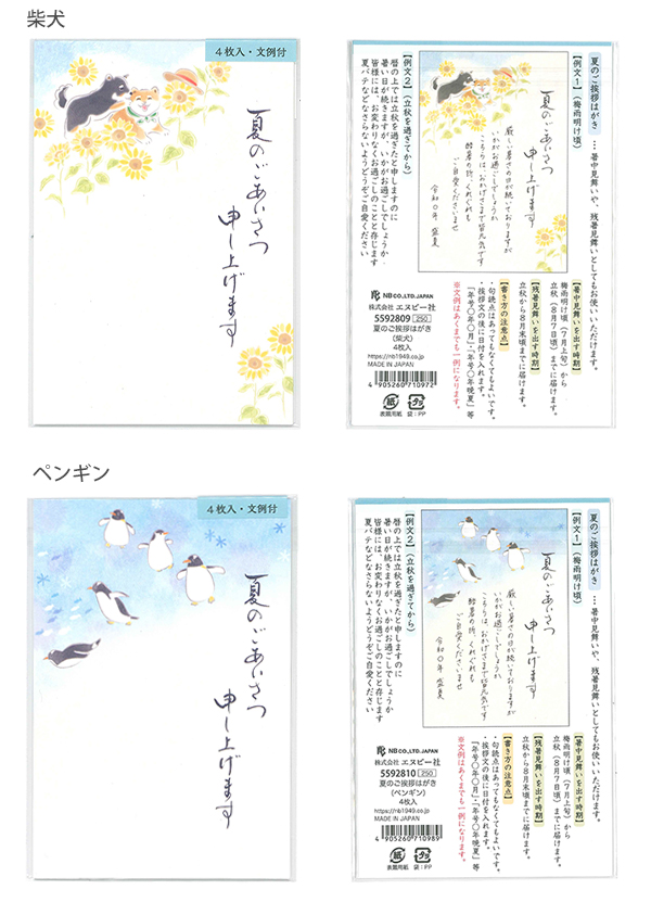 NB エヌビー 夏のご挨拶はがき 4枚入り 黒猫5592811/アザラシ5592812/柴犬5592809/ペンギン5592810 暑中見舞い サマーカード