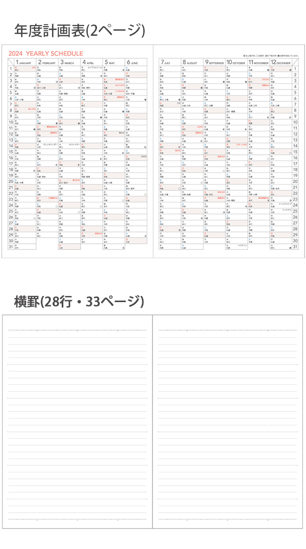- 年間カレンダー / 年度計画表 / 月間予定(見開き1カ月・ブロック式) / 横罫(28行)
