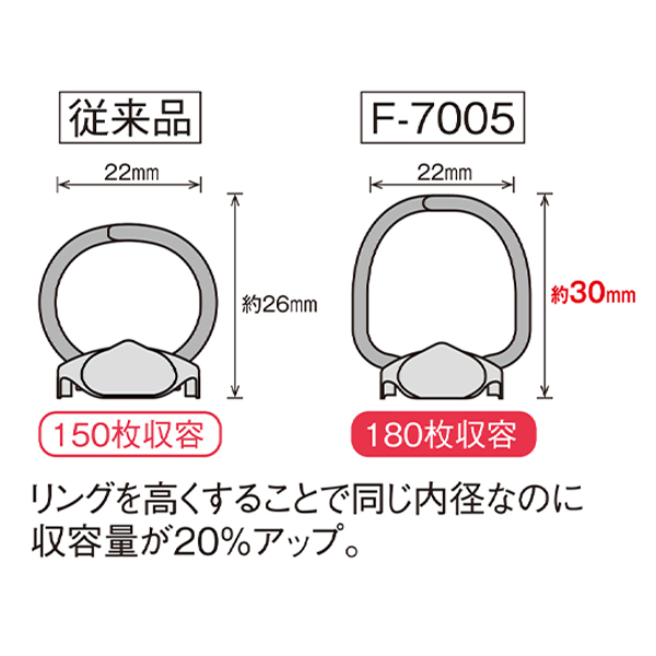 内径22mmのリングが円形ではなく高くなってることにより、書類を多く収容することができます。