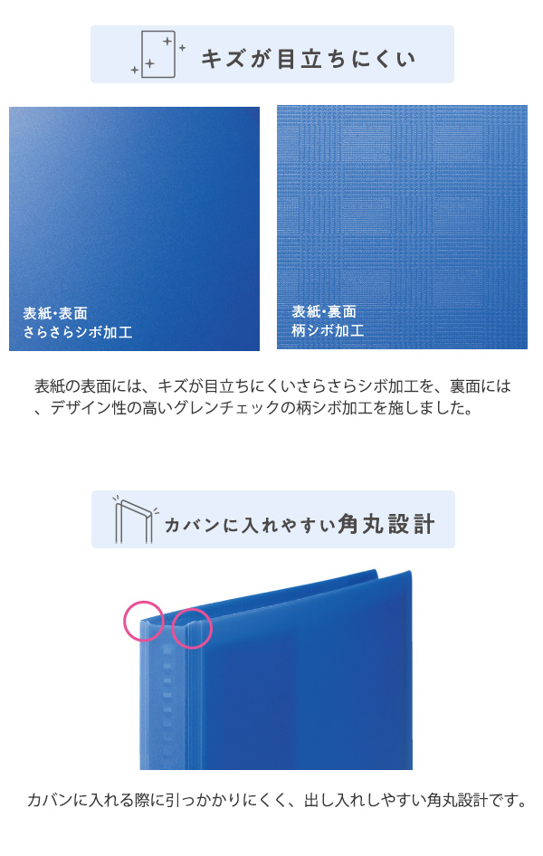 表紙の表面はキズが目立ちにくいさらさらシボ加工。