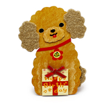 胸のPUSHボタンを押すと犬の鳴き声の後「お誕生日おめでとワン!」の声出るバースデーカードです。プレゼントを前に引き出し後ろの支えを使えば立てて飾れます。