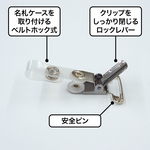名札をしっかりロック!! ポケットに留めることもできるソフトタイプのIDカード用吊り下げ名札です。