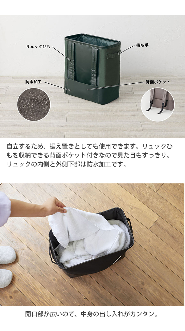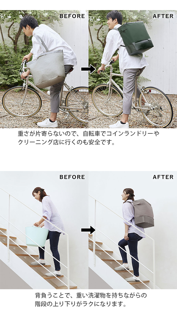 背負うことで、洗濯物をラクに持ち運べる「ランドリー リュック」。