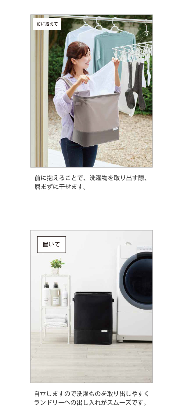 コインランドリーやクリーニング店にそのまま持って行けるほか、自立するので、洗濯カゴとしても使えます。