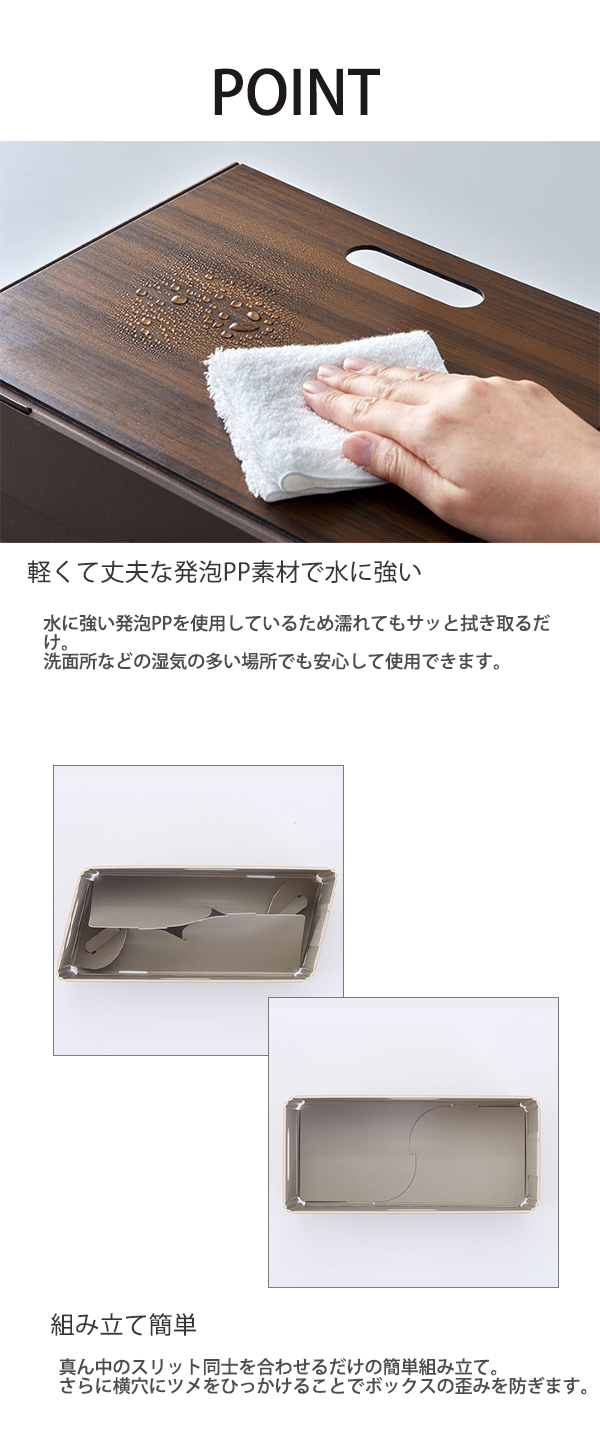 組み立て簡単な暮らしに馴染む木目調の収納ボックスです。