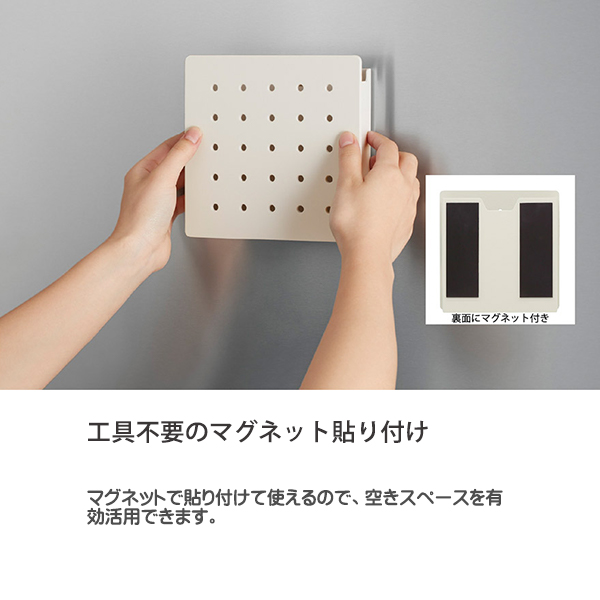 本体裏面のマグネットによって、キッチンや玄関、オフィスのロッカーなどに貼り付けて使用できるので空きスペースを有効活用できます。