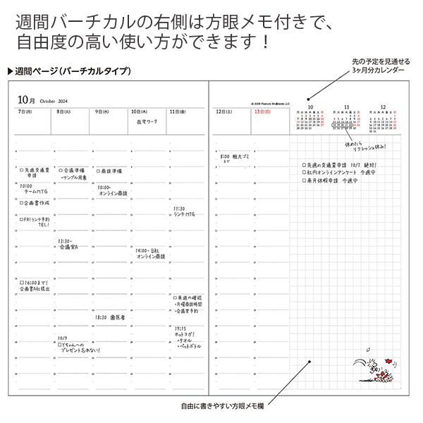 可愛らしいスヌーピーのデザインがカバーに施されています。仕事や予定管理を楽しく彩ります。
