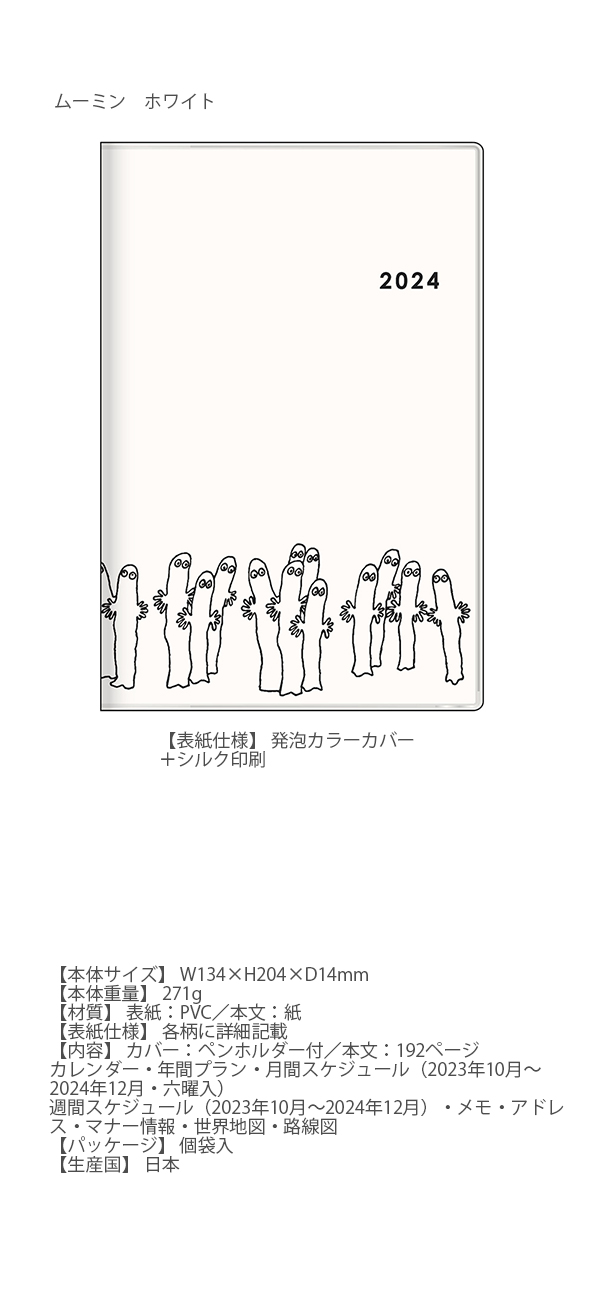 サンスター 手帳週間A5スリムバーチカル ムーミン ピンク S2956748 / ベージュ S2956756 / ホワイト S2956764 月間スケジュール(2023年10月~2024年12月・六曜入)週間スケジュール(2023年10月~2024年12月)