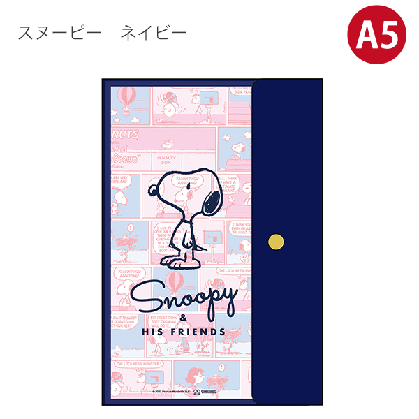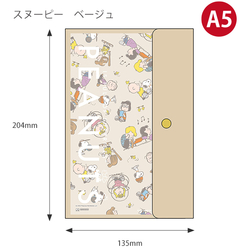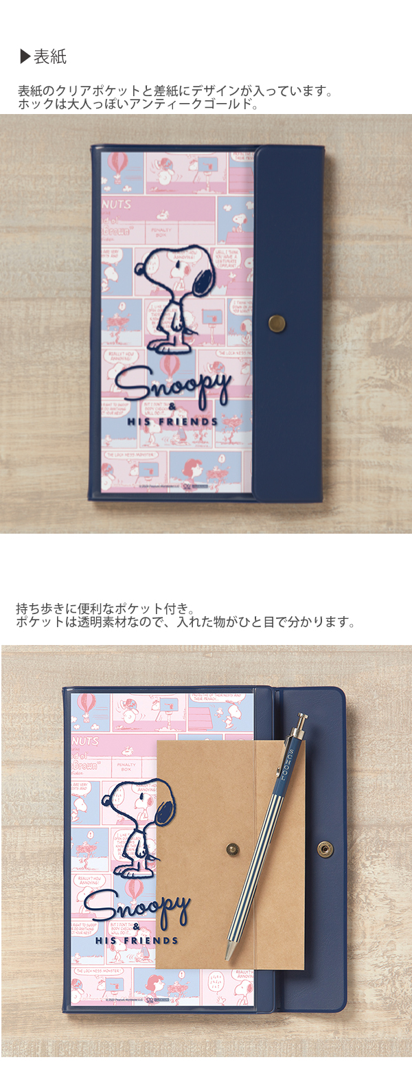 表紙にはクリアポケットが施され、愛らしいスヌーピーのデザインが目を引きます。ベージュとネイビーの2つのカラーオプションでお選びいただけます。アンティークゴールドのホックが、大人っぽさを演出します。