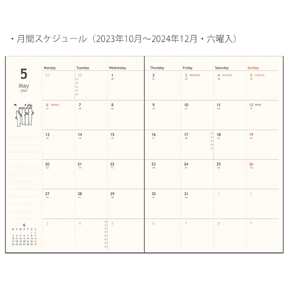 2023年10月から2024年12月までの六曜を含む月間スケジュールに対応した、人気のB6サイズ手帳カバーです。