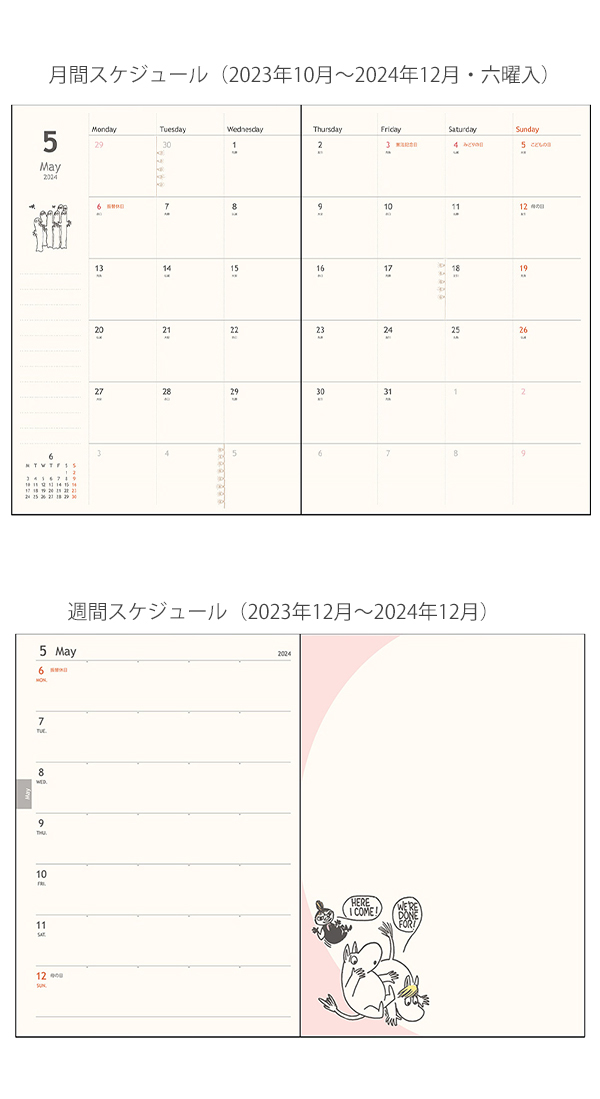 サンスター 手帳週間B6ストーリーブック ムーミン リトルミイ S2957310 / ムーミン ムーミンやしき S2957329 月間スケジュール(2023年10月~2024年12月・六曜入)週間スケジュール(2023年12月~2024年12月)