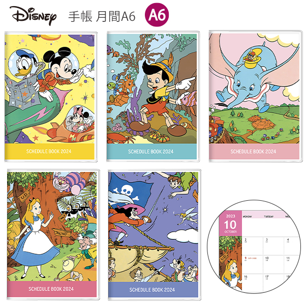 サンスター 手帳月間A6 DC ミッキー S2957353 / DC ピノキオ S2957361 / DC ダンボ S2957370 / DC アリス S2957388 / DC ピーター・パン S2957396 月間スケジュール(2023年10月~2024年12月・六曜入)