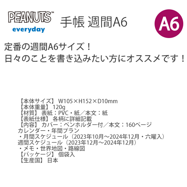 - カバー:ペンホルダー付/本文:160ページ/カレンダー・年間プラン・月間スケジュール(2023年10月~2024年12月・六曜入)