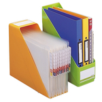 縦・横いずれも使えます。ファイルや雑誌を収納するほかインデックスホルダーなどを整理収納しても便利です。スタックボックス前面にはるタイトルシールが付いています。