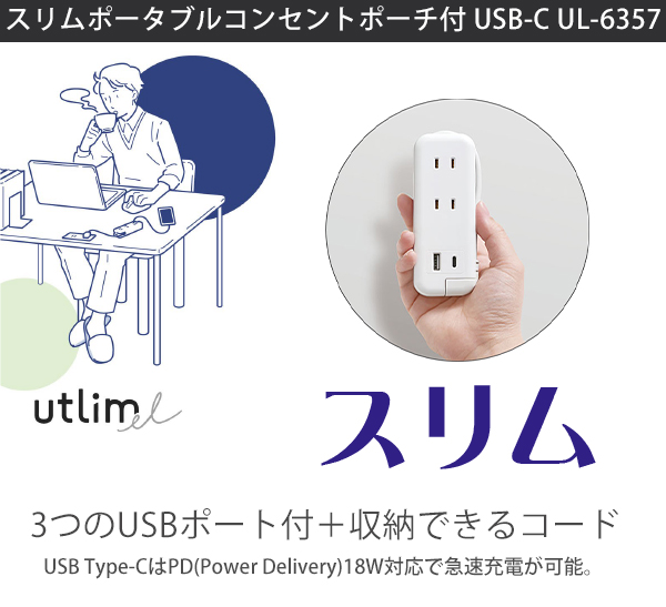 ソニック スリム ポータブルコンセント ポーチ付 USB-C UL-6357 ホワイトW/ネイビーK