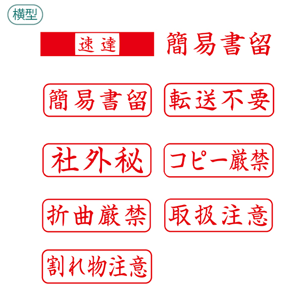 - 速達ヨコ/簡易書留タテ枠ナシ/簡易書留ヨコ枠ナシ/書留速達タテ/配達証明タテ/速達小包タテ/書留小包タテ/簡易書留タテ/簡易書留ヨコ/転送不要タテ/転送不要ヨコ/社外秘ヨコ/コピー厳禁ヨコ/折曲厳禁タテ/折曲厳禁ヨコ/取扱注意タテ/取扱注意ヨコ/割レ物注意タテ/割レ物注意ヨコ/ゆうメールタテ/